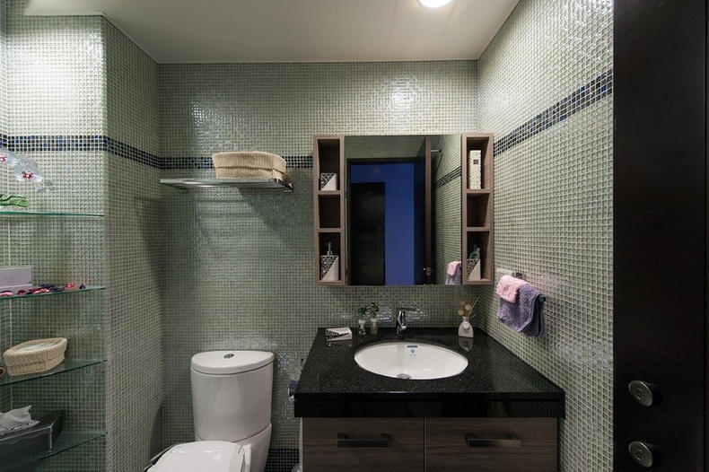 在小衛(wèi)生間的設(shè)計(jì)中,通過巧用鏡子,不僅能增加視覺的寬敞感,還能夠讓我們更好的化妝打扮,非常實(shí)用。