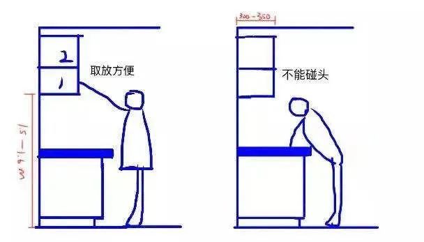 常規(guī)來說,吊柜地板和地柜臺面的高度保證在50~60cm左右,剛剛好。