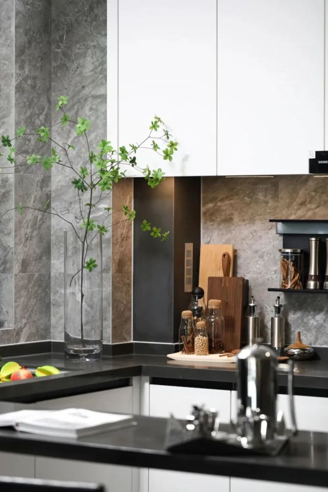 當然,這也意味著廚房的臺面并非要“一馬平川”,也可以做高低臺,大范圍適用家里其他成員使用廚房,比如洗菜區(qū)、備餐區(qū)或者烹飪區(qū)可以適度做成高低臺,建議灶臺高度比臺面高度低6-8cm左右,顛勺更爽!