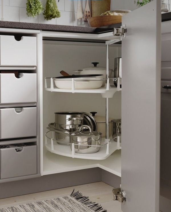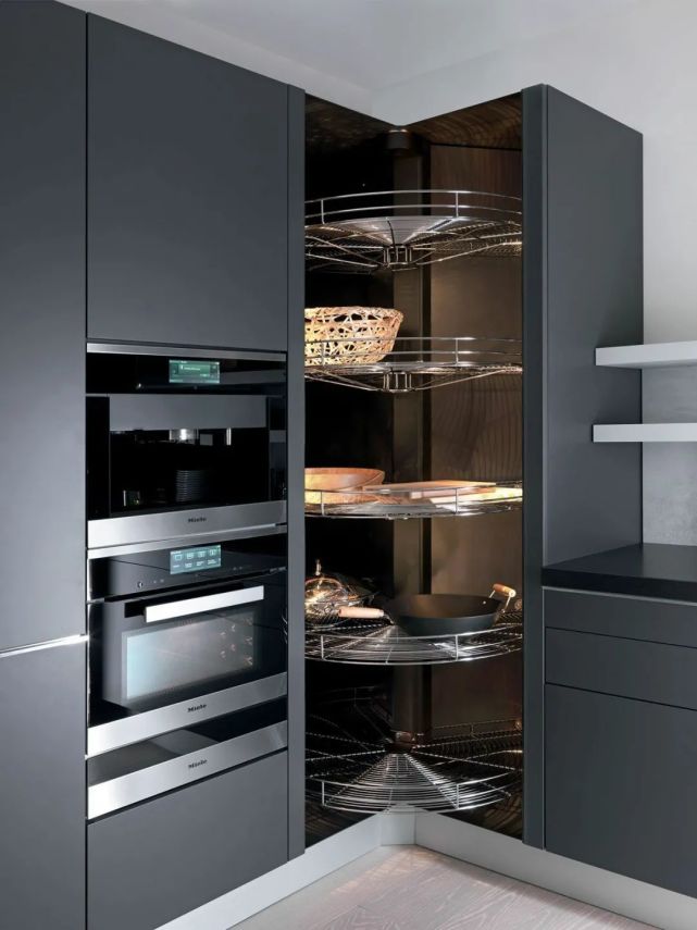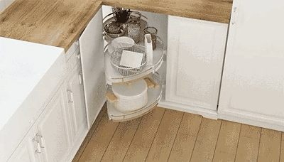 很多時候,廚房會因結構原因難免出現(xiàn)拐彎或者轉角,柜上空間還好利用,可地柜柜內(nèi)空間過深,拿取物品很不方面,最后,難免成為收納死角,成雞肋?