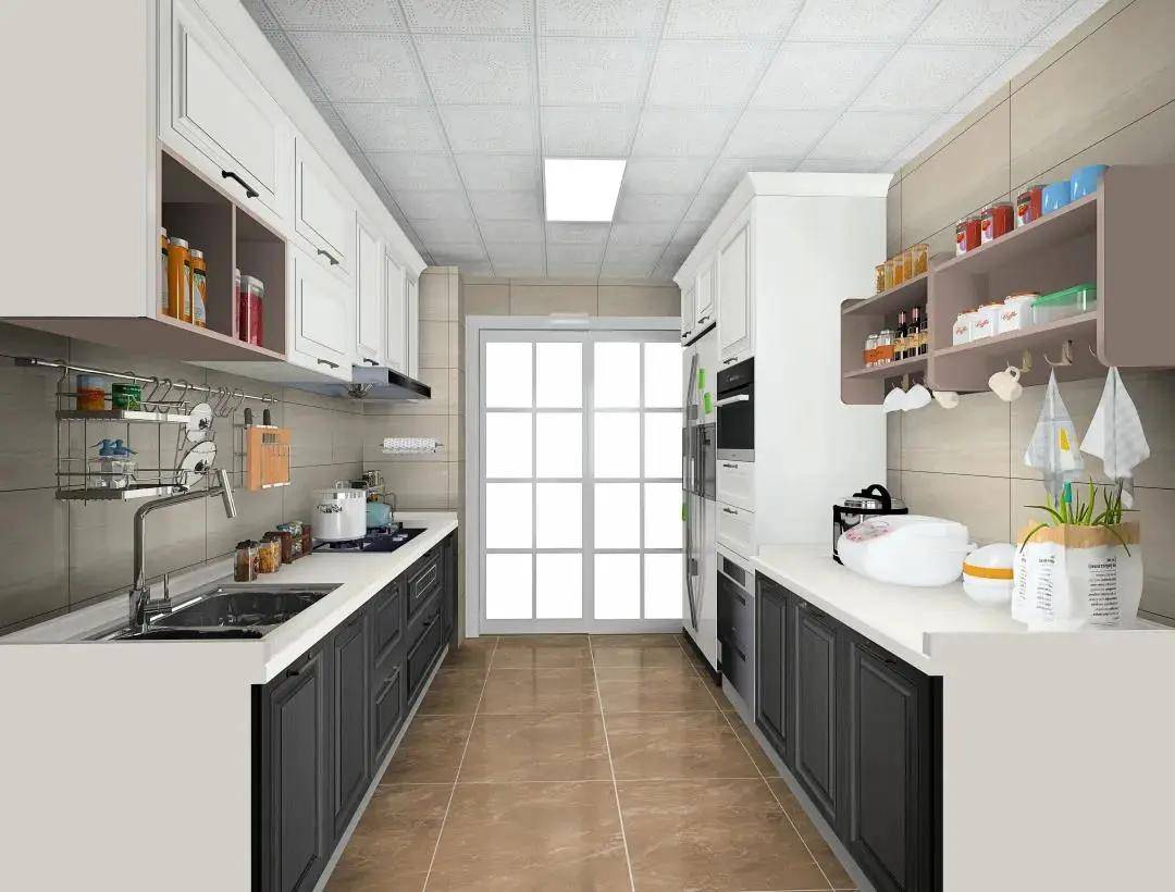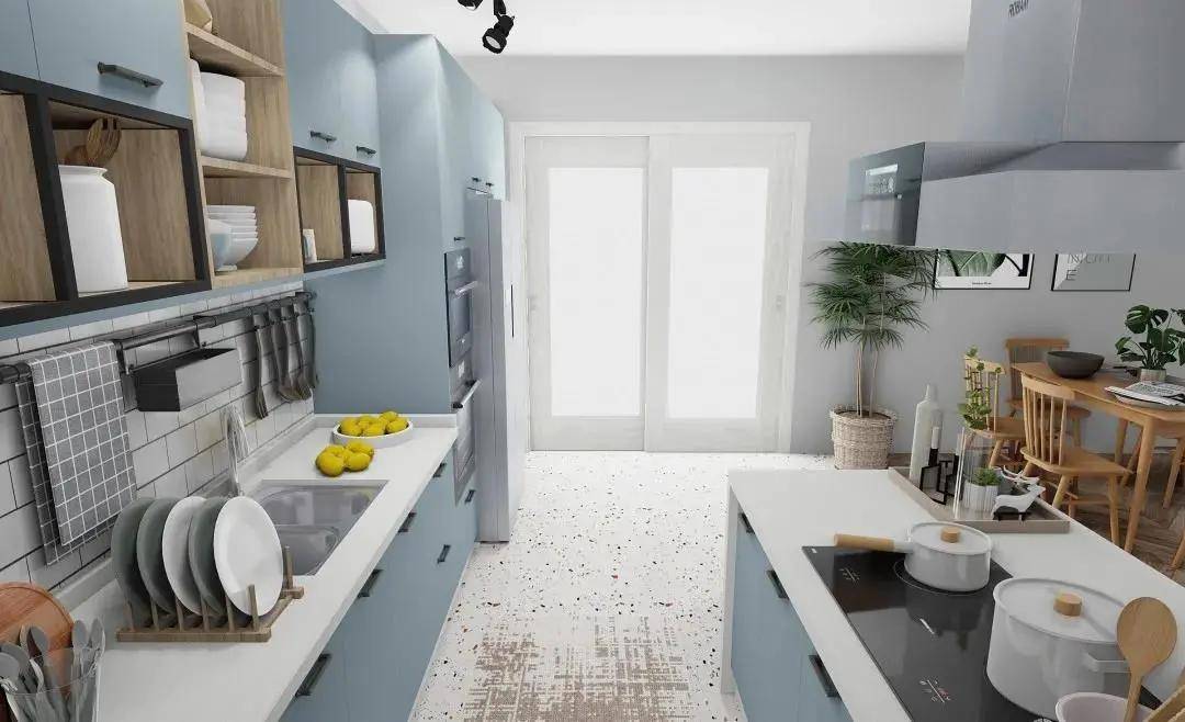 將操作區(qū)安排在兩邊平行線上,儲(chǔ)物區(qū)→備餐區(qū)→烹制區(qū)二字排列,動(dòng)線迂回貫穿做飯流程。儲(chǔ)存空間大,靈活性增強(qiáng),同時(shí)對(duì)廚房寬度要求高。