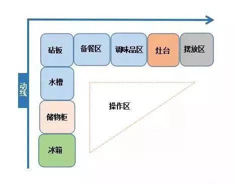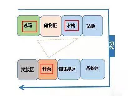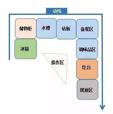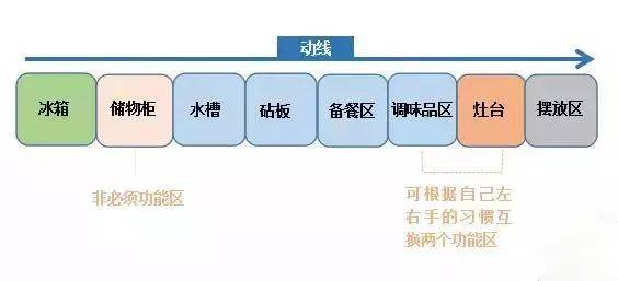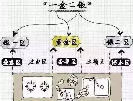 首先我們先來看一張圖,沒錯(cuò),這就是我們的做法習(xí)慣流程圖,廚房布局要保證這一系列流程的流暢性,那這樣的廚房才是滿分的??赡芎芏嗳瞬恢?,關(guān)于廚房的功能分區(qū),我們有一個(gè)“潛規(guī)則”,那就是“一金二銀區(qū)域”。