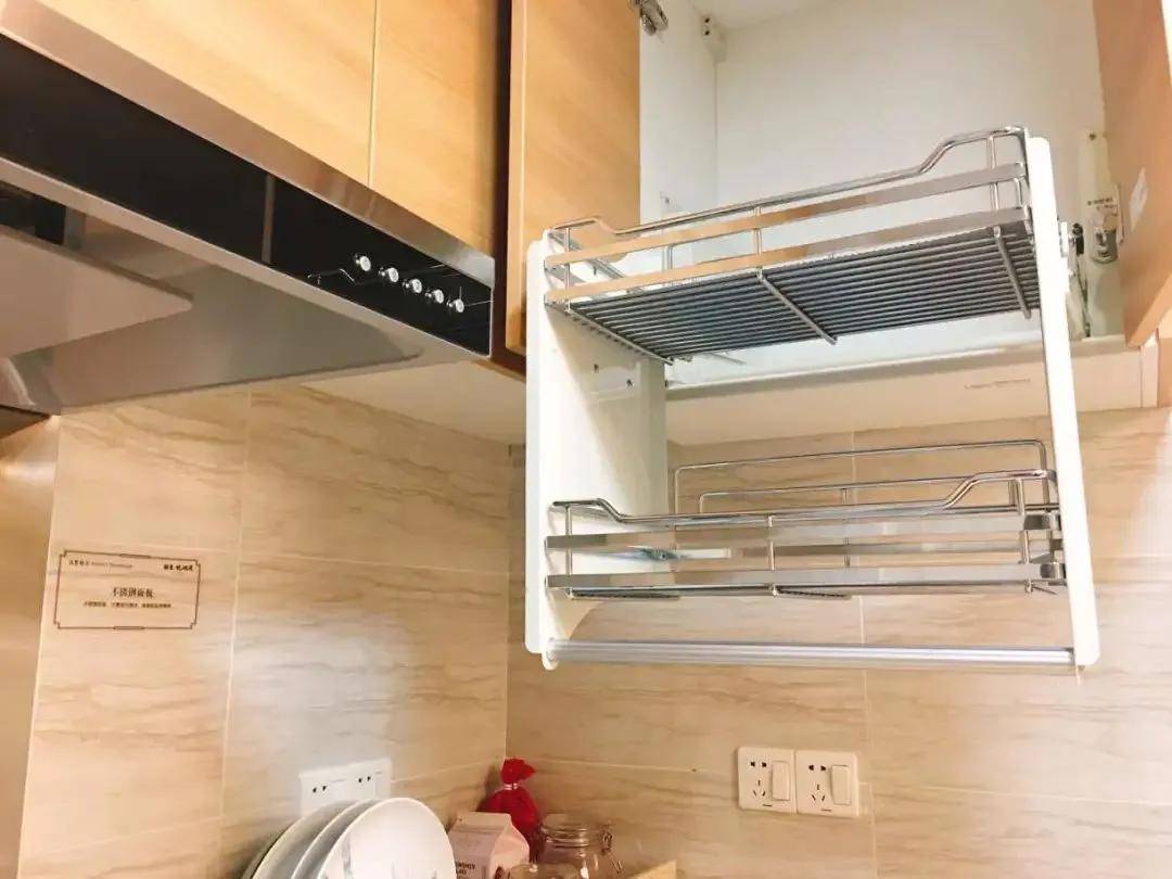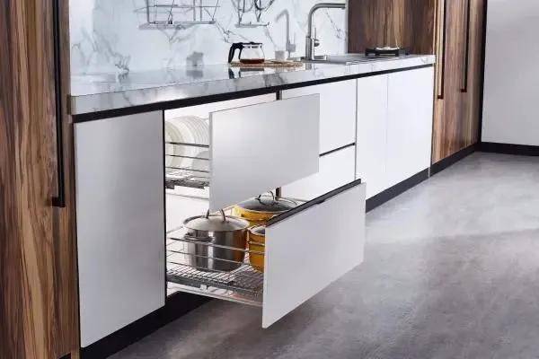 使用頻次高的地方,一定要安裝拉籃或者抽屜。轉(zhuǎn)角拉籃,能更好的利用櫥柜角落空間;升降拉籃,提高吊柜的收納空間,拿東西很方便。