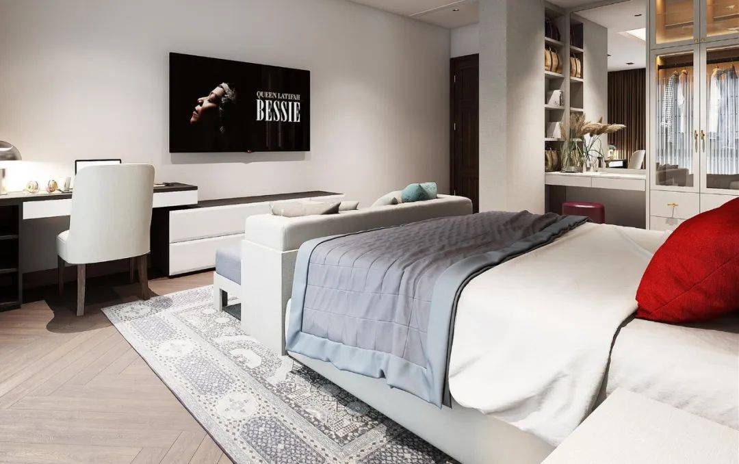 如果臥室空間足夠大,并且床尾沒有裝衣柜的話,那么就可以在床尾處擺一個(gè)斗柜/電視柜,電視機(jī)就放在床尾的柜臺(tái)上,這樣躺在床上就剛好看到電視機(jī)的位置,非常方便舒適。