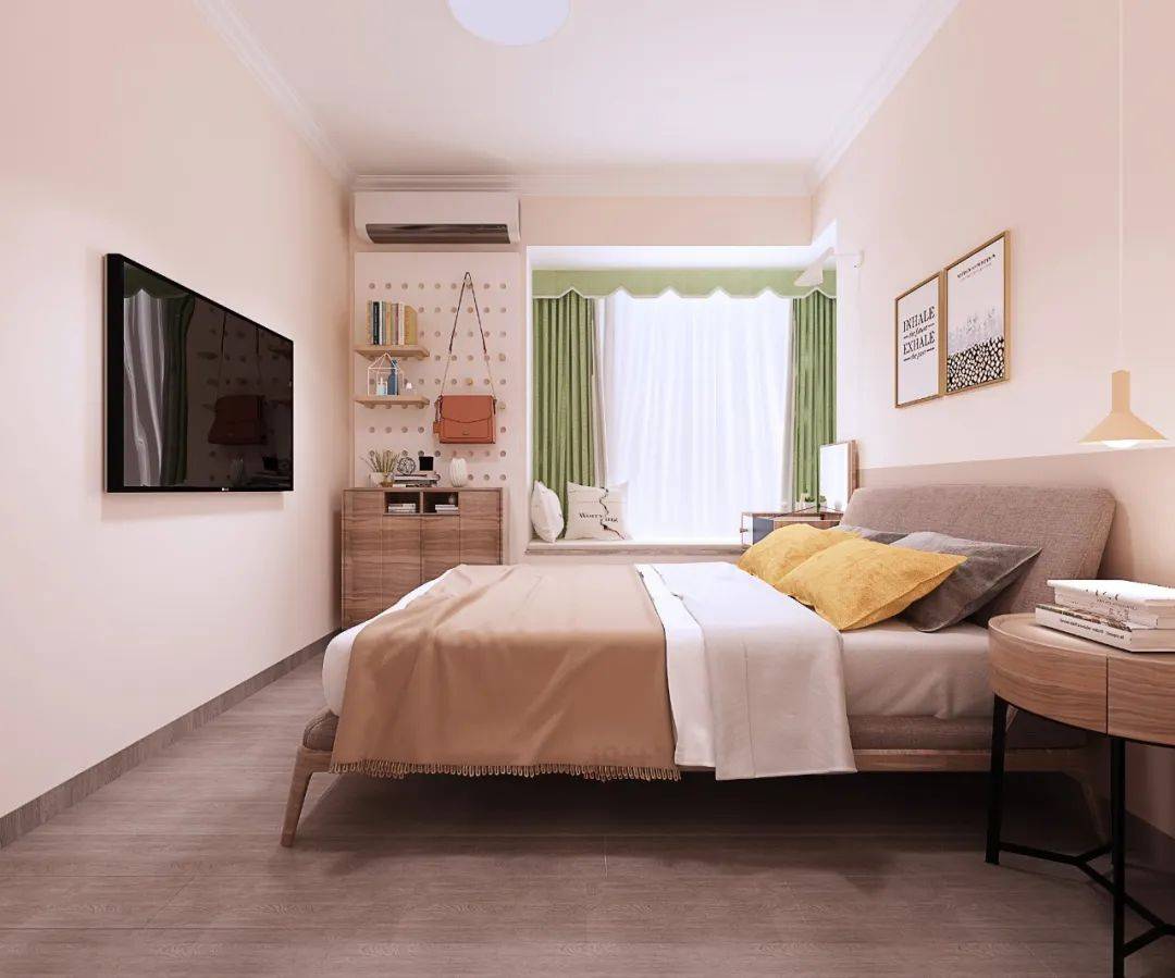 同樣是床尾沒裝衣柜的臥室,如果床尾擺不下斗柜的話,也可以采取壁掛安裝電視機(jī)的方式,在有限的臥室空間實(shí)現(xiàn)電視機(jī)的功能。現(xiàn)在的電視機(jī)都很薄,壁掛安裝的話,不會(huì)占用多少空間,適合面積較小的臥室戶型。