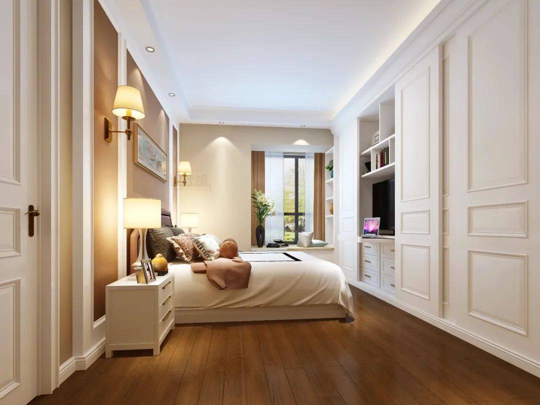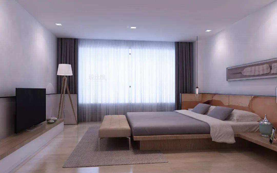 床尾處放電視機(jī)、人靠在床頭看——這是最舒服的姿勢(shì),當(dāng)床尾要裝衣柜的時(shí)候,電視機(jī)的安裝就無(wú)法采用常規(guī)的設(shè)計(jì)思路了!這個(gè)時(shí)候就可以考慮把電視與衣柜結(jié)合起來(lái)設(shè)計(jì),比如衣柜做推拉門設(shè)計(jì),中間留個(gè)電視柜的位置。