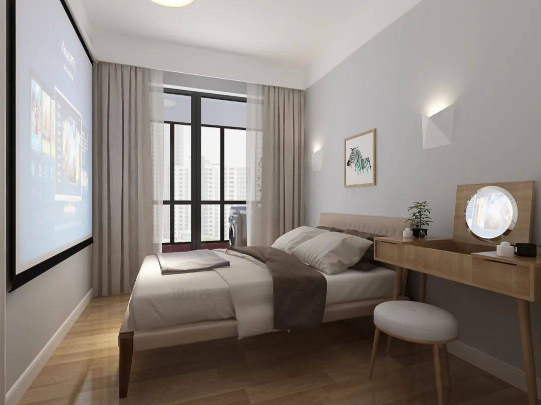 投影儀可以投影在白墻或白色柜門上,而電動(dòng)幕布安裝也可以隱藏在天花上方,對(duì)床尾空間的布置利用不會(huì)有太大的影響,如果臥室空間有限,也可以考慮用投影儀的方案。