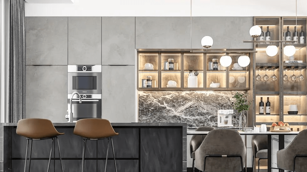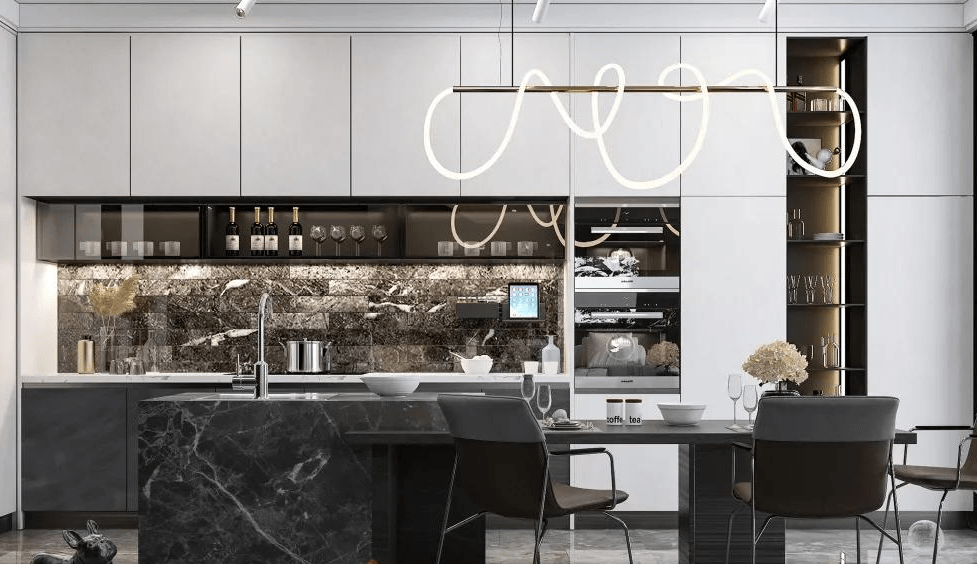 或者用吧臺作為廚房與客廳之間的隔斷,同時搭配上幾把椅子,吧臺也可以成為用餐區(qū)。平時還可以作為休閑區(qū)域。比如下午茶、品酒吧臺等等,增添生活的趣味。