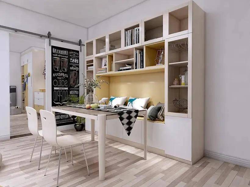 相對于傳統(tǒng)餐椅,卡座可以節(jié)省至少20%的空間,同時卡座的底部還可以用來做儲物柜,放置餐廳區(qū)域的一些雜物,進(jìn)一步緩解小戶型家庭的收納壓力。