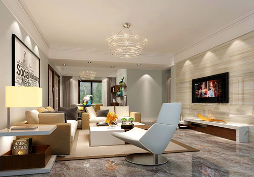 客廳是家人和親友相聚的地方,需要營造出溫暖、融洽的氣氛。圓形的燈飾、天花造型、以及裝飾品,在心理上給人以溫馨之感,也正好符合這樣的要求。